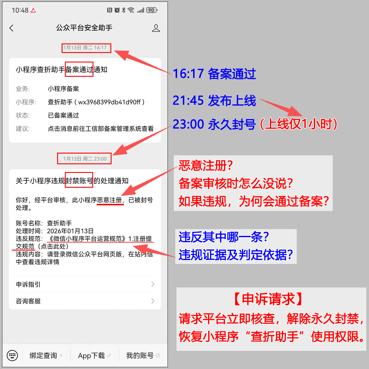 •请求平台立即核查,解除对“查折助手”小程序的永久封禁,恢复正常使用权限。