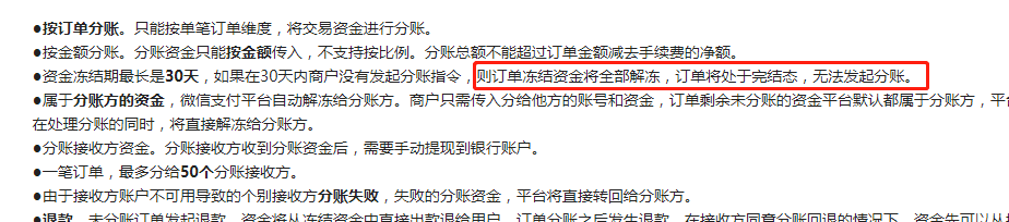 订单金额在商户内冻结,知道分账完成,最长冻结30天