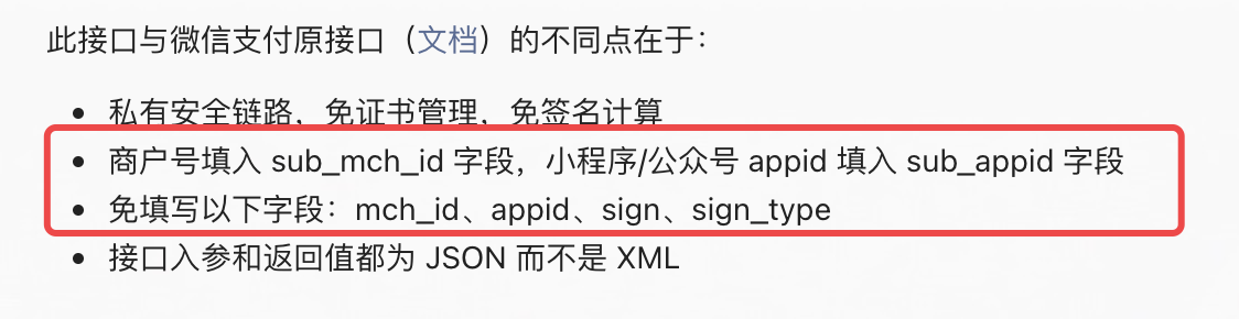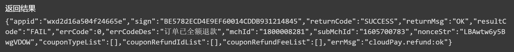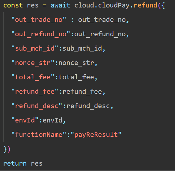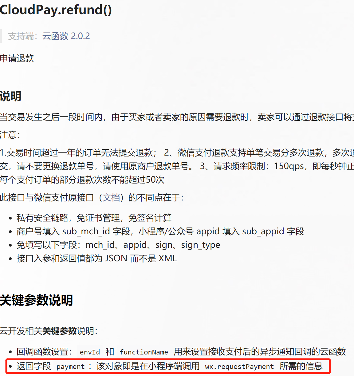 有很多小问题,对于初次用云支付退款的小白,真的不够友好。比如说返回的信息中,不包含payment,导致wx.requestPayment报参数错误。文档中要求有使用wx.requestPayment。所以应不应该调用requestpayment呢?如果像支付那样,提供一段示例代码,就清晰多了。 错误信息: requestPayment: fail parameter error: parameter.timeStamp should be String instead of Undefined; parameter.package should be String instead of Undefined; parameter.signType should be String instead of Undefined; parameter.paySign should be String instead of Undefined; 以为调用过程和支付一样,但是又报没有payment,退款结果却成功了。所以弄不明白究竟要不要写requestPayment?