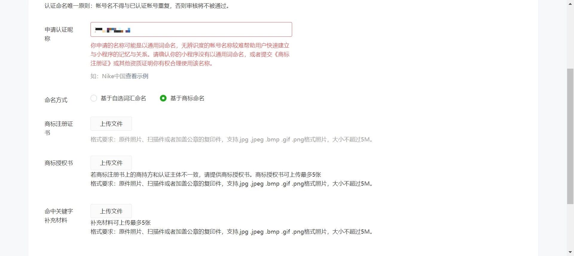 如下图,小程序上线后需要改名,非个人账号的要进行认证改名,请问在申请认证昵称中填的是想要改成的小程序名称吧,以及,这个命中关键字补充材料为何意?感谢回答!