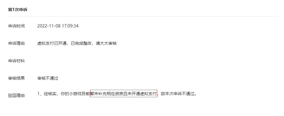 appid:wxe6ea9cf24f0b9aa2,该游戏已经补充了相关资质,且已经开通起了虚拟支付,然后发起申诉,又打回来说未补充资质和开通虚拟支付?麻烦大佬认真帮忙核查一下