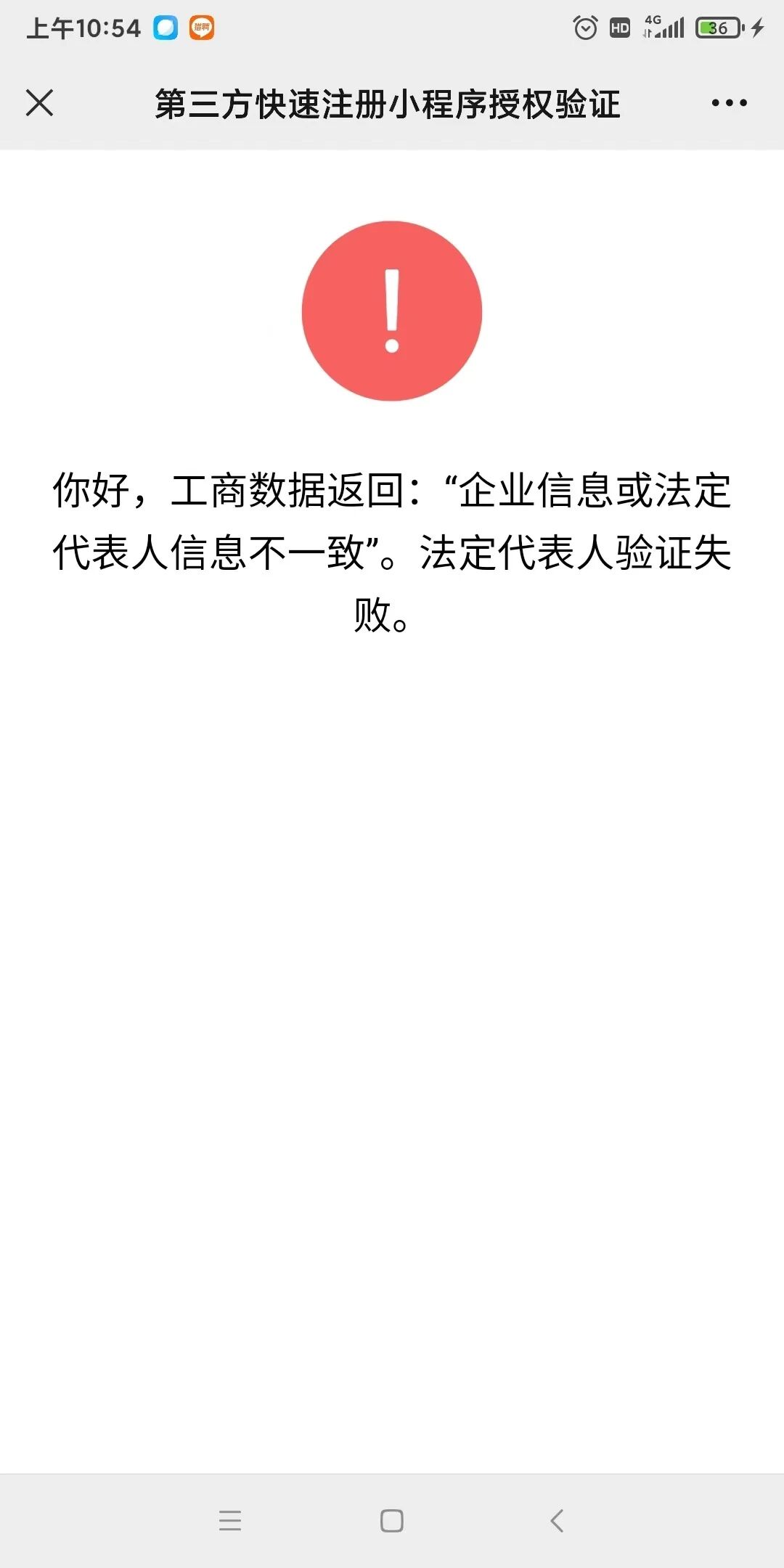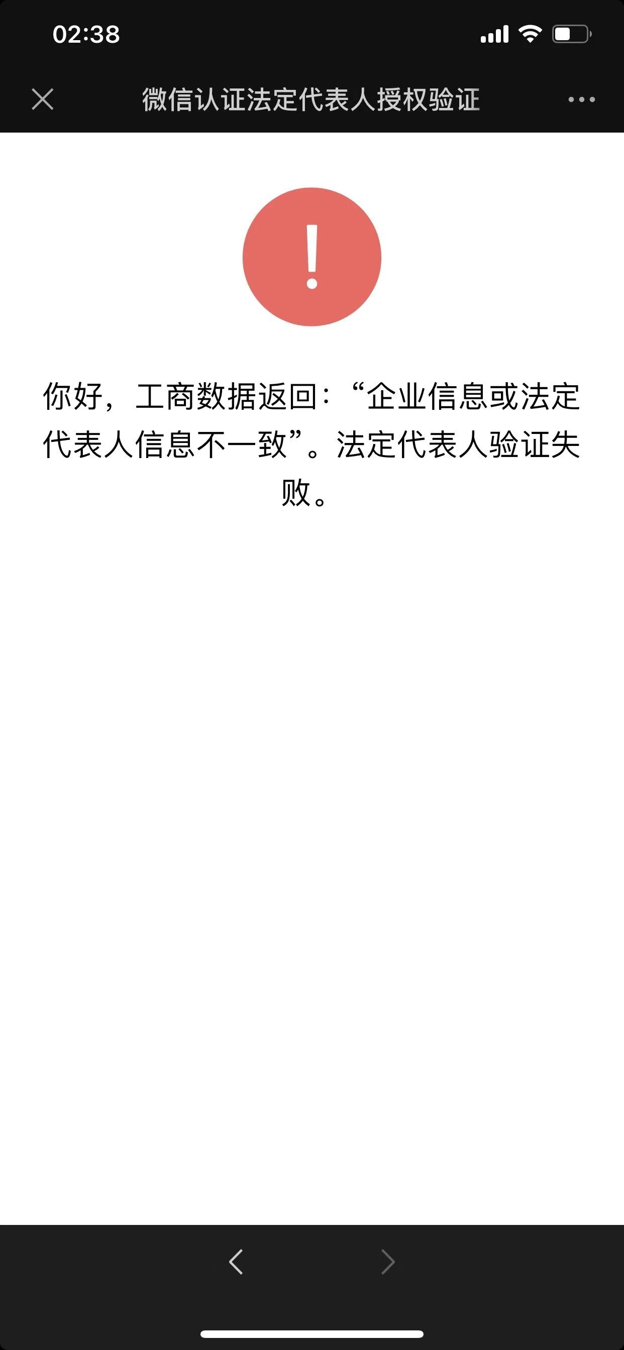 小程序在认证的时候提示“企业信息或者法定代表人信息不一致”。营业执照下来5天了,网上已经可以查询,