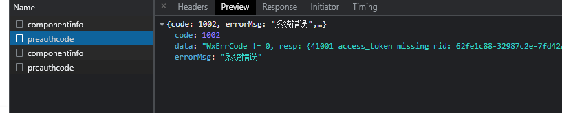 返回: {"code":1002,"errorMsg":"系统错误","data":"WxErrCode != 0, resp: {41001 access_token missing rid: 62fe1c88-32987c2e-7fd42a3a}"}