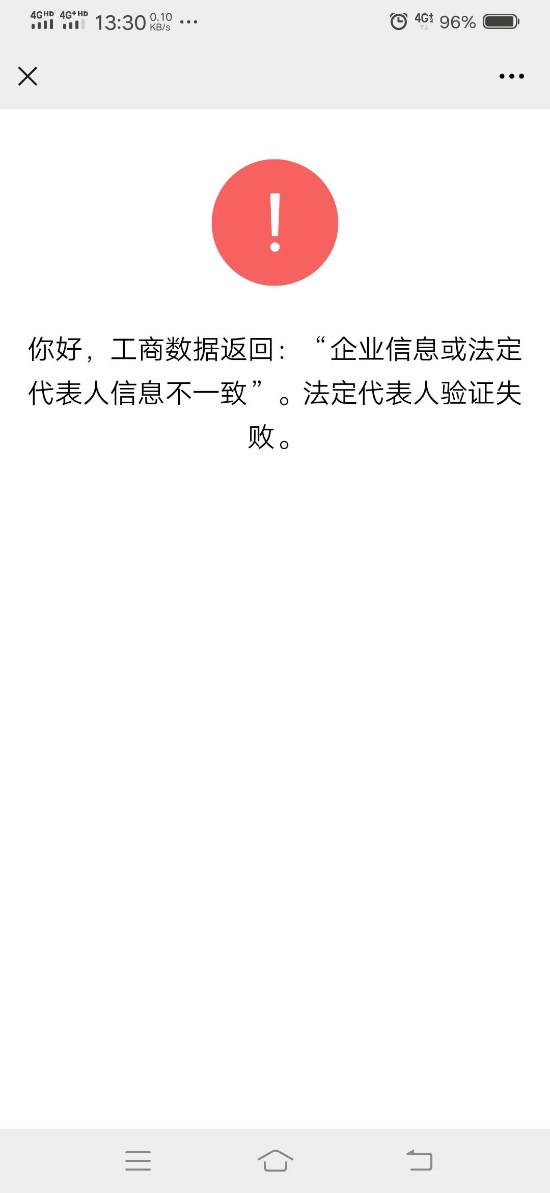 你好,工商数据返回:“企业信息或法定代表人信息不一致”。法定代表人验证失败