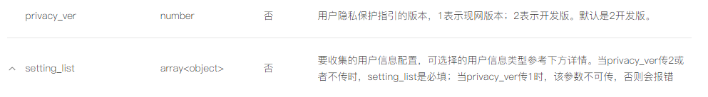 https://developers.weixin.qq.com/doc/oplatform/openApi/OpenApiDoc/miniprogram-management/privacy-management/setPrivacySetting.html 建议参考步骤执行:提交代码--->稍等(若小程序是首次提审代码后台需要些时间检测)--->get接口看下需要补什么信息---->set隐私---->提交审核---->提交发布 注意:小程序用户隐私保护指引项的说明需要有准确、清晰的使用场景、目的。