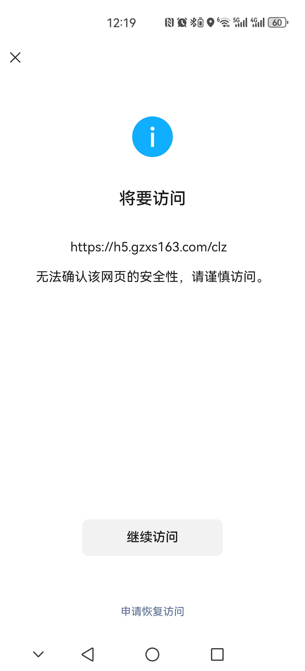 您好,域名(https://h5.gzxs163.com/clz/)域名在腾讯云注册并备案通过,申请恢复也没用。服务器也在腾讯云,浏览器访问正常,我是网站开发者,访问时间如图微信访问网站出现“无法确认该网页的安全性,请谨慎访问”,经检查网页里没有不安全的内容,请核实后帮忙解除拦截,谢谢!