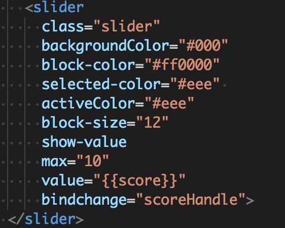 <slider class="slider" backgroundColor="#ddd" block-color="#ffd73d" activeColor="#ffd73d" block-size="12" show-value max="10" value="{{score}}" bindchange="scoreHandle" />