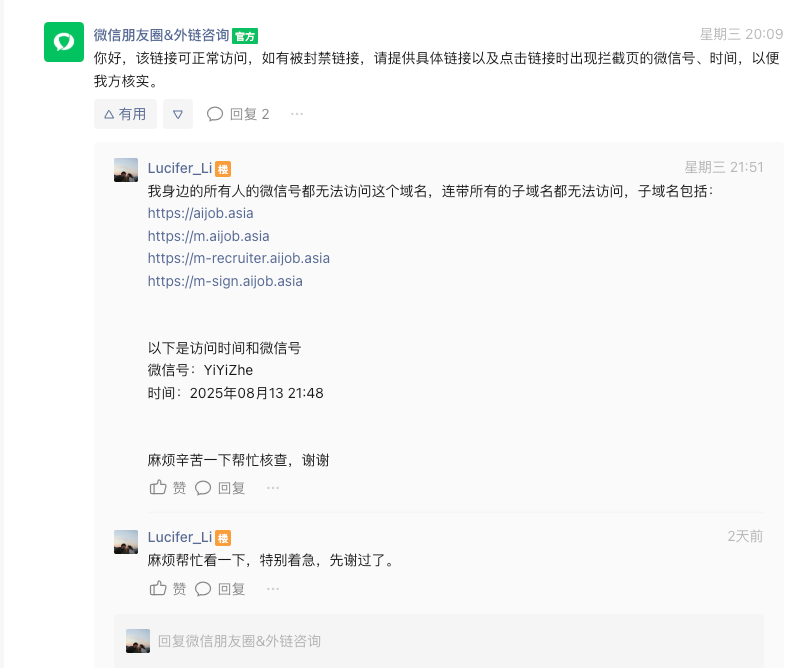 我的域名都是企业内部管理系统还有问卷系统,所有域名全部被封禁了,导致我所有的产品都用不了了,aijob.asia这个域名下的所有子域名都无法访问,麻烦核实一下,官方说没有问题但是还是无法访问