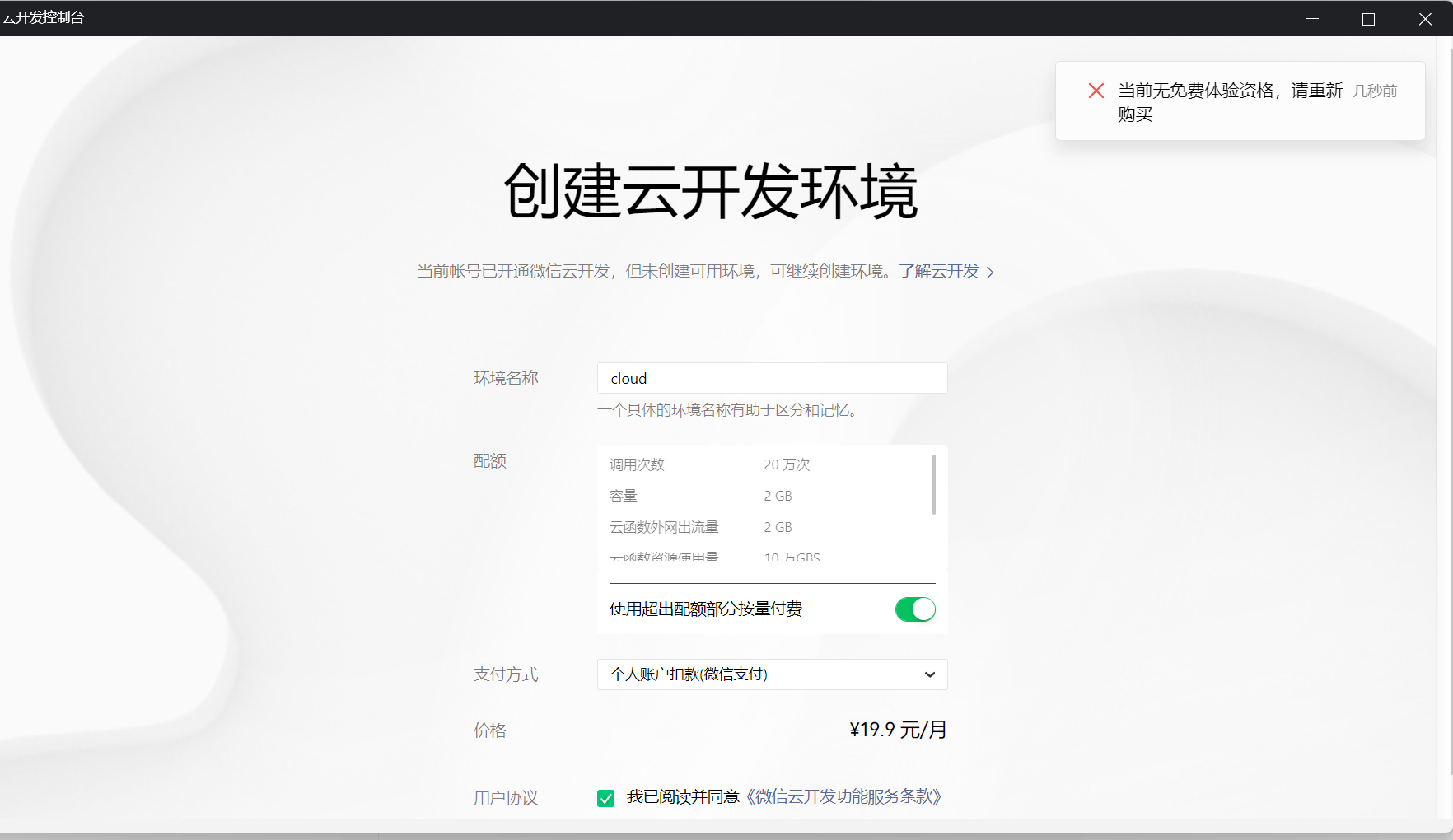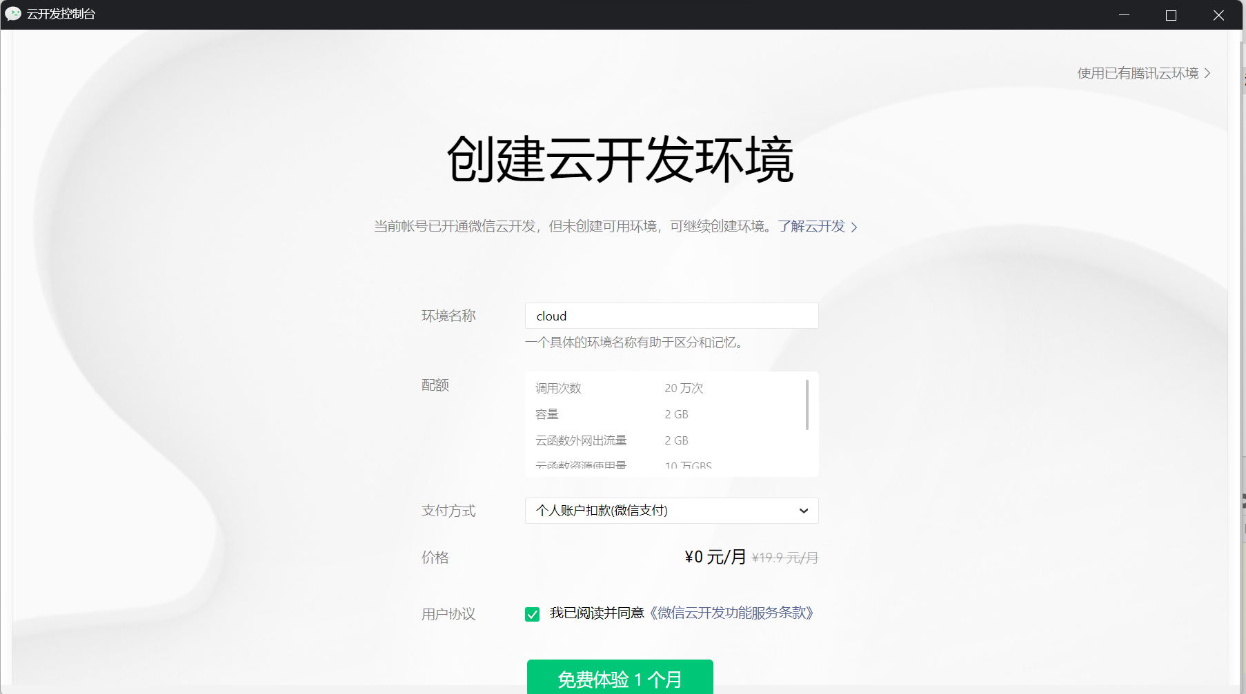 解决了,在微信小程序开发工具里点云开发就可以免费了