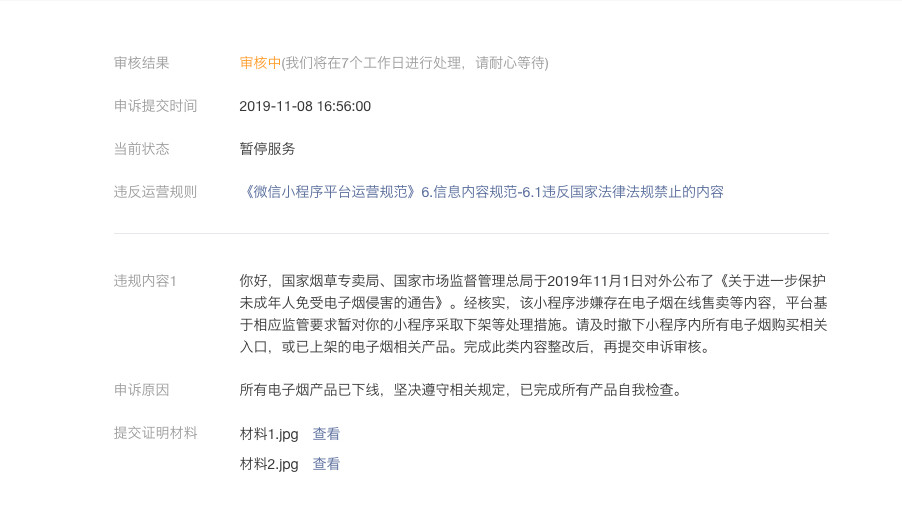 小程序封禁,我们在2019年11月8号完成整改后提交审核,审核已经超过7个工作日,是否能加急处理