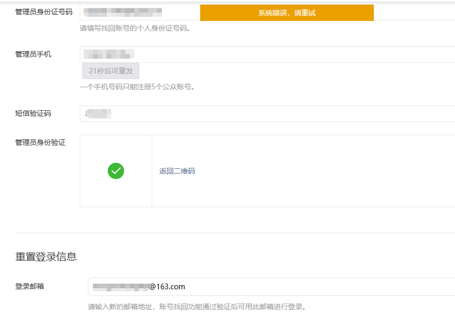 因为登陆账号是离职同事的qq邮箱,已经无法联系之前的离职同事,之前已经有提问过如何解决,收到回答是可以通过找回账号来解决,但是今天尝试找回账号,重置登录邮箱,从上午尝试过发现一直显示系统错误,请重试,然后下午再试了一下,还是同样的情况,请问是怎么回事呢?如何解决?