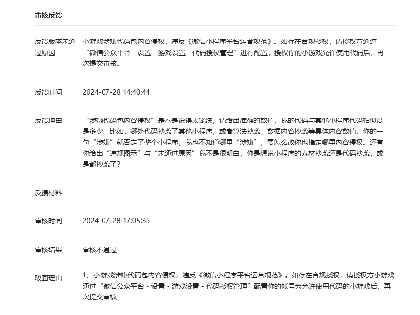 代码包内容侵权,就指出那段代码抄袭了谁的源代码,或者是通过代码分析工具计算出小程序代码包与其他小程序源代码的相似度,有一个明确的证据,而不是截了几张与“未通过原因”毫不相关图片来糊弄鬼呢