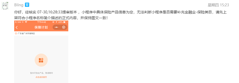 小程序"亿苗保"代码发布审核未通过,提示需要我公司补充服务类目:金融类-保险类目。