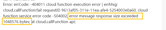 Error: errCode: -404011 cloud function execution error | errMsg: cloud.callFunction:fail requestID 9613af05-311e-11ea-afe4-5254003e0a60, cloud function service error code -504002, error message response size exceeded 1048576 bytes; at cloud.callFunction api;