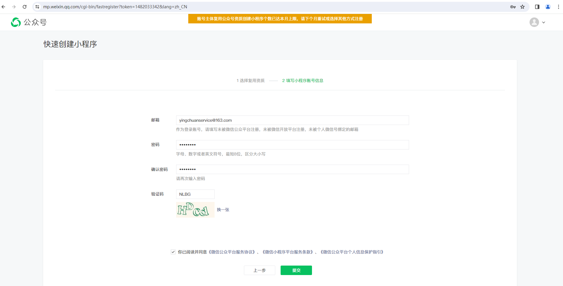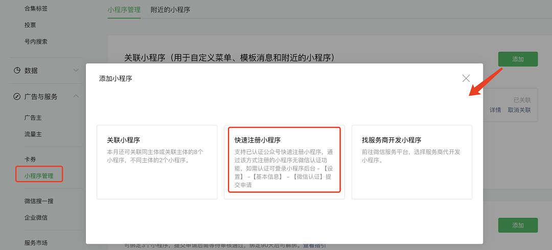 如题,我在已认证的服务号,使用快速注册小程序功能,注册了一个小程序。但是注册成功后,小程序显示仍需要进行微信认证。我以为是没关联成功,回到服务号想要重新快速注册的时候,却提示我本月已经使用改功能不能再使用了。请问现在该如何处理?