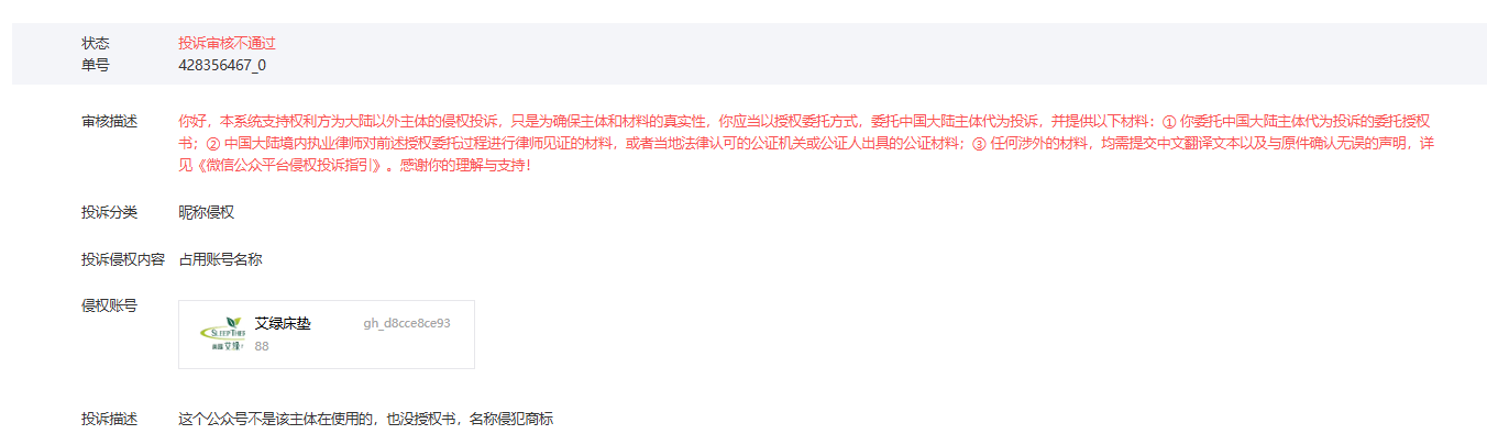 你好,本系统支持权利方为大陆以外主体的侵权投诉,只是为确保主体和材料的真实性,你应当以授权委托方式,委托中国大陆主体代为投诉,并提供以下材料:① 你委托中国大陆主体代为投诉的委托授权书;② 中国大陆境内执业律师对前述授权委托过程进行律师见证的材料,或者当地法律认可的公证机关或公证人出具的公证材料;③任何涉外的材料,均需提交中文翻译文本以及与原件确认无误的声明,详见《微信公众平台侵权投诉指引》。感谢你的理解与支持! 投诉分类 昵称侵权