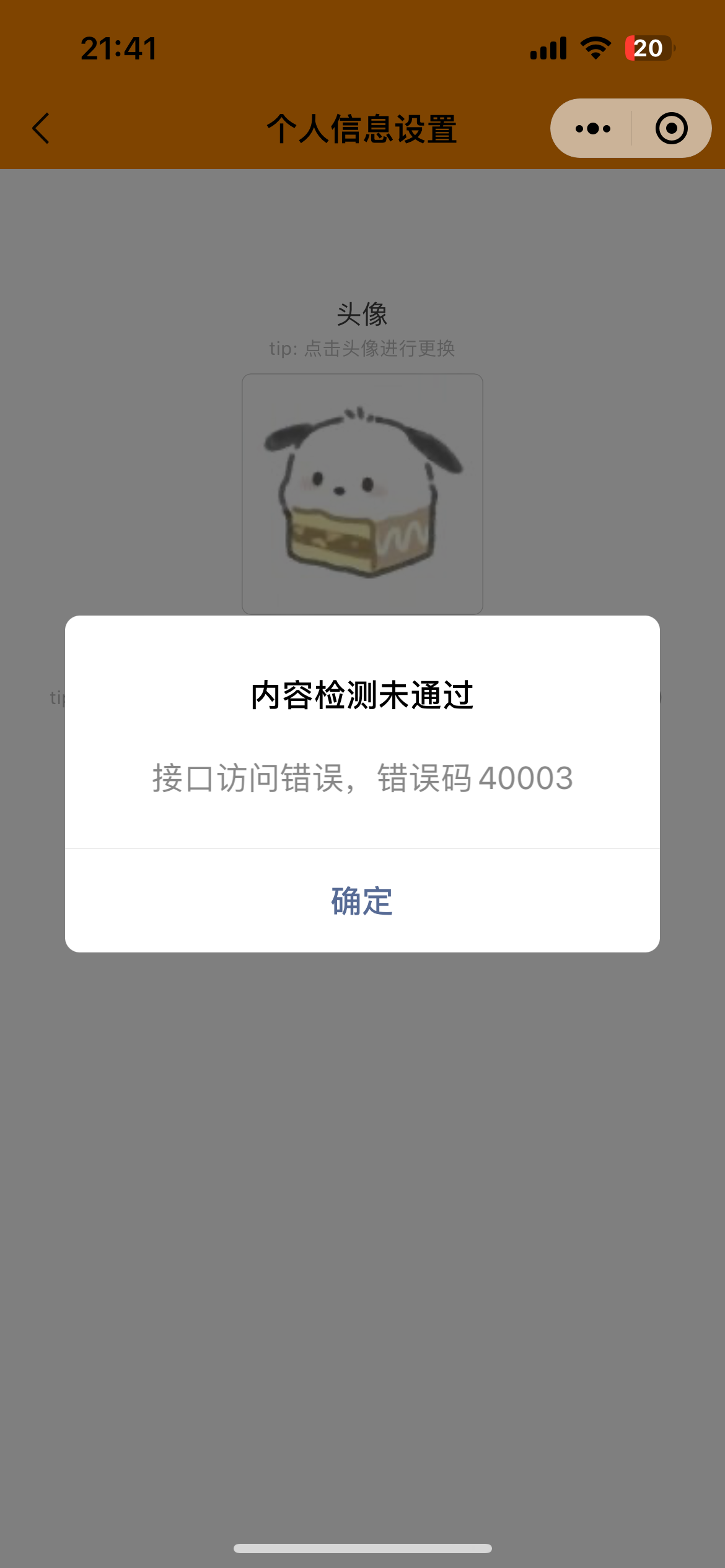 如何解决图片上的问题,第一个授权微信昵称和头像时出现:内容检测未通过,接口访问错误,错误码40003