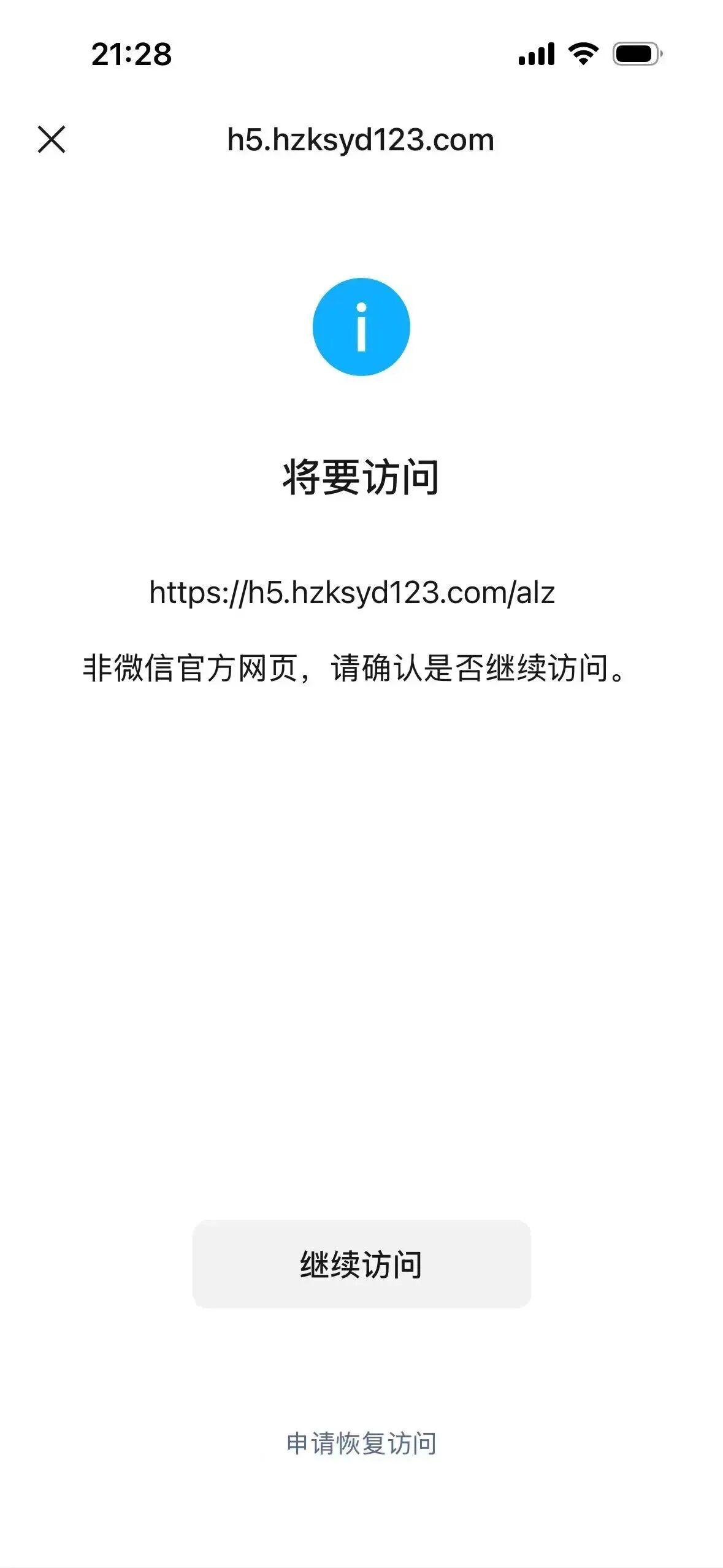 您好,域名(https://h5.hzksyd123.com/alz)域名在腾讯云注册并备案通过,服务器也在腾讯云,浏览器访问正常,我是网站开发者,访问时间如图微信访问网站出现“非微信官方网页,请确认是否继续访问”,经检查网页里没有不安全的内容,是微信官方网页,请核实后帮忙解除拦截,谢谢!