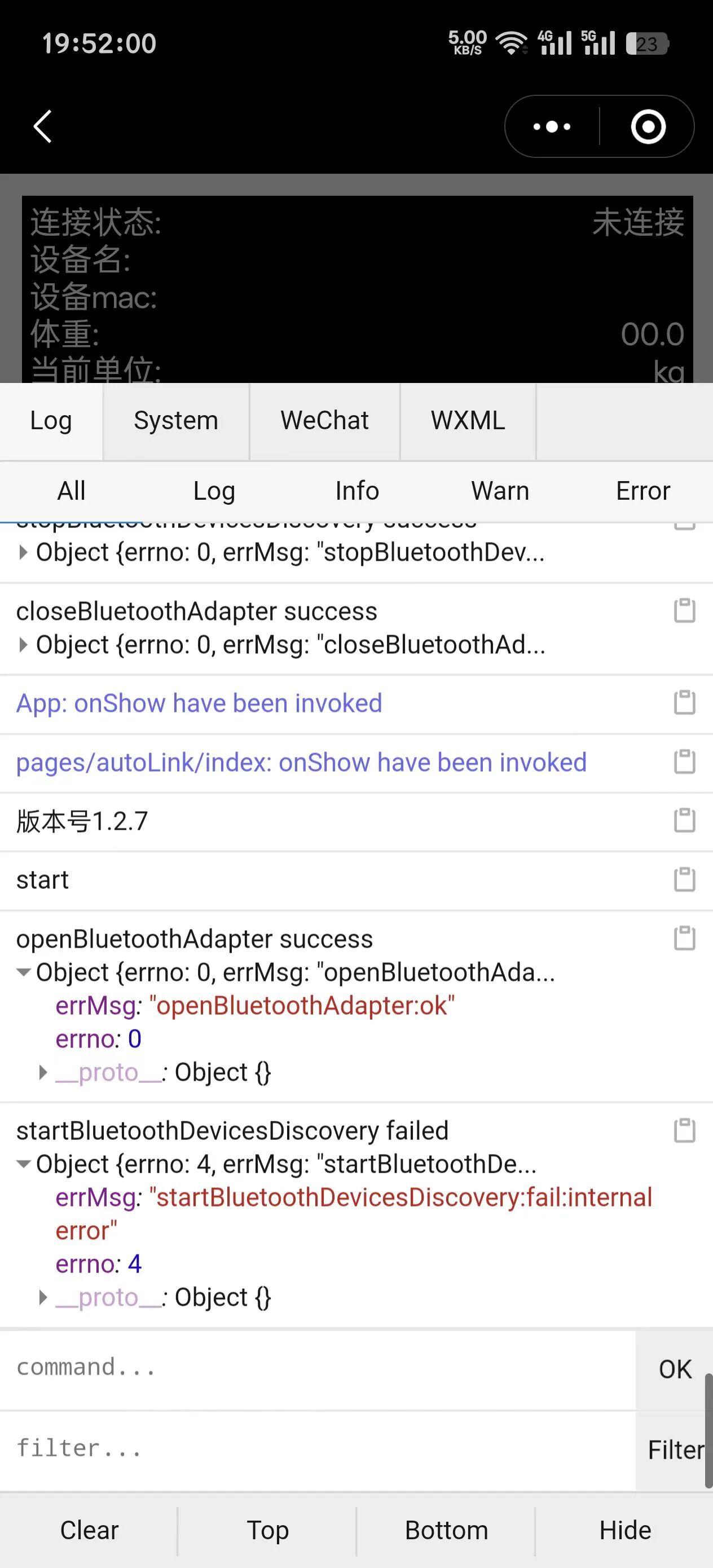 机型是一加ace5pro,蓝牙、定位、附近设备都开了,但是wx.startBluetoothDevicesDiscovery报错,返回{errMsg: 'startBluetoothDevicesDiscovery:fail:internal error',errno: 4}