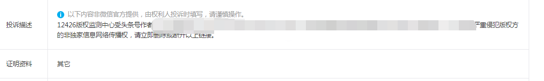 经查询“12426版权监测中心” 是第三方公司“上海冠勇信息科技有限公司”运营的。现在根本搞不清楚这个“上海冠勇信息科技有限公司”到底是国家政府机构还是第三方商业公司。不管是哪个,你们这样恶意批量举报的行为已经严重影响了我们创作者。希望微信官方建立一套机制。对于恶意投诉举报的建立惩罚机制。这么肆无忌惮的举报别人已经属于侵犯别人的权利了。平台多次认定投诉不成立,但是“上海冠勇信息科技有限公司”这家公司还在举报。感觉是自动批量举报系统。