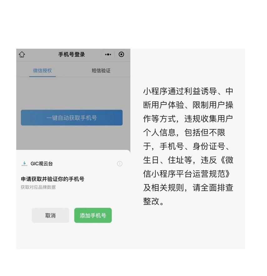 你好,目前我们小程序的微信一键获取手机号登录被禁用了,理由如下图,不过我们观云台小程序是给商户提供数据查看的,面向的是商户的工作人员,非所有微信用户。而只有账号登录才能识别出账号所属商户,返回相应商户数据,所以想了解下,如何才能继续使用微信授权登录