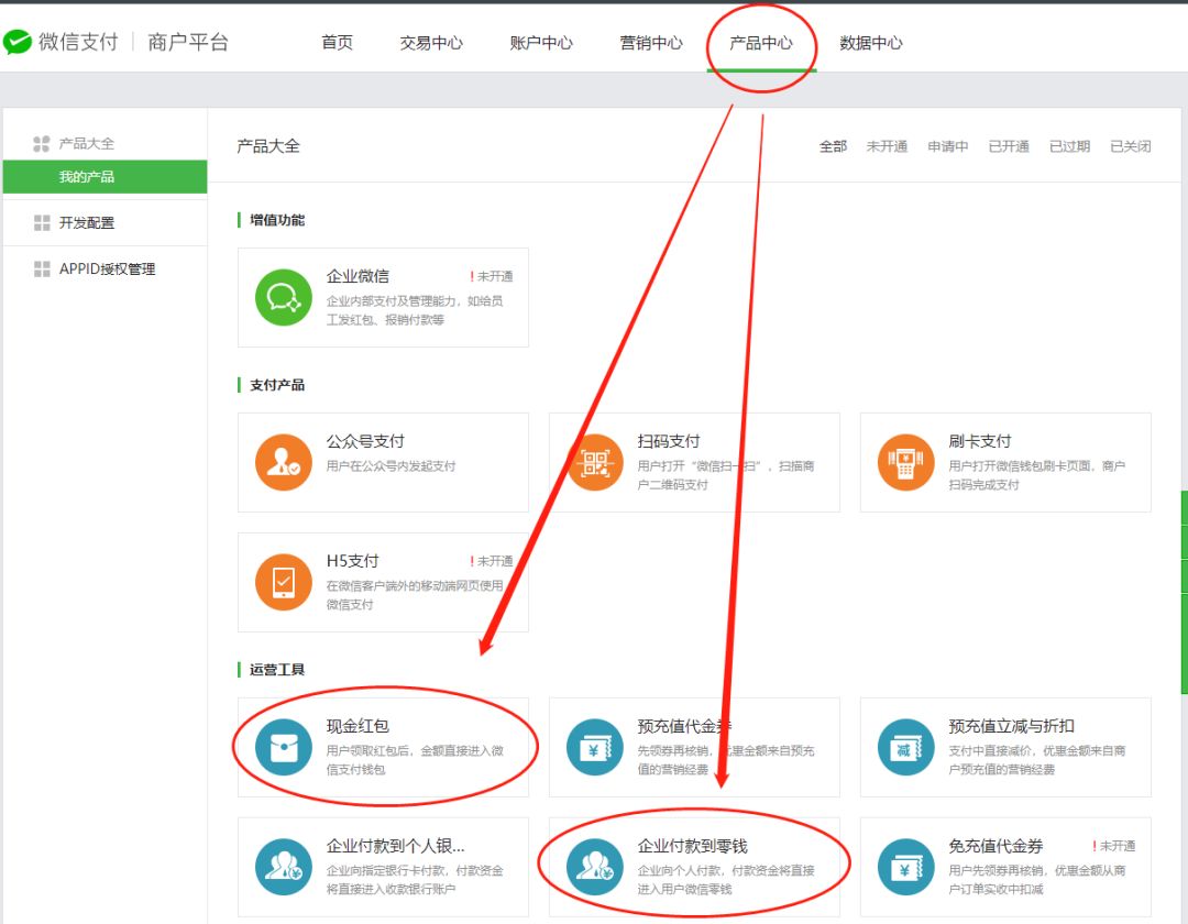 商户平台功能已开通,运营账户钱也有,还要在商户平台开通该产品,你要的是企业付款到零钱,所以选下面那个