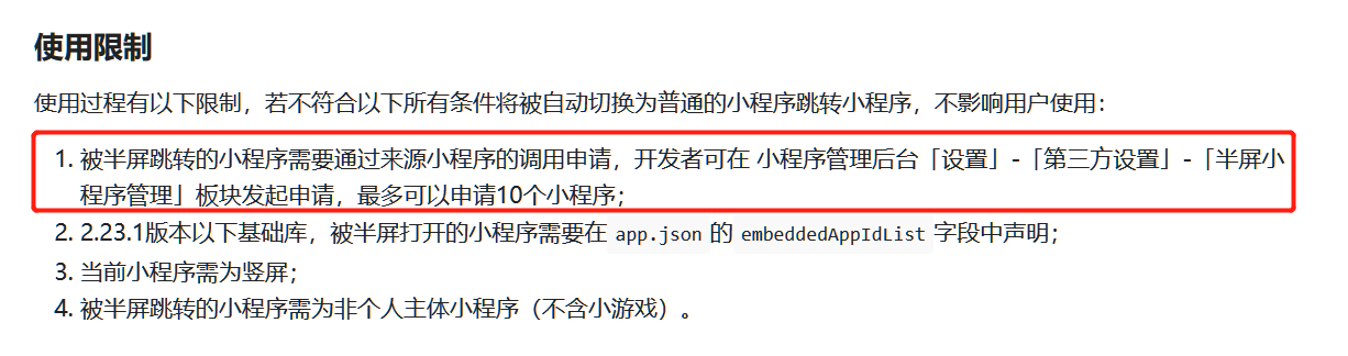 上面是官方文档对半屏小程序的使用限制,由于业务场景需要跳转的小程序是可配置的,而且跳转的数量也超过十个;希望能取消第一条限制,请问官方大大,后续会放宽跳转半屏小程序的限制吗?