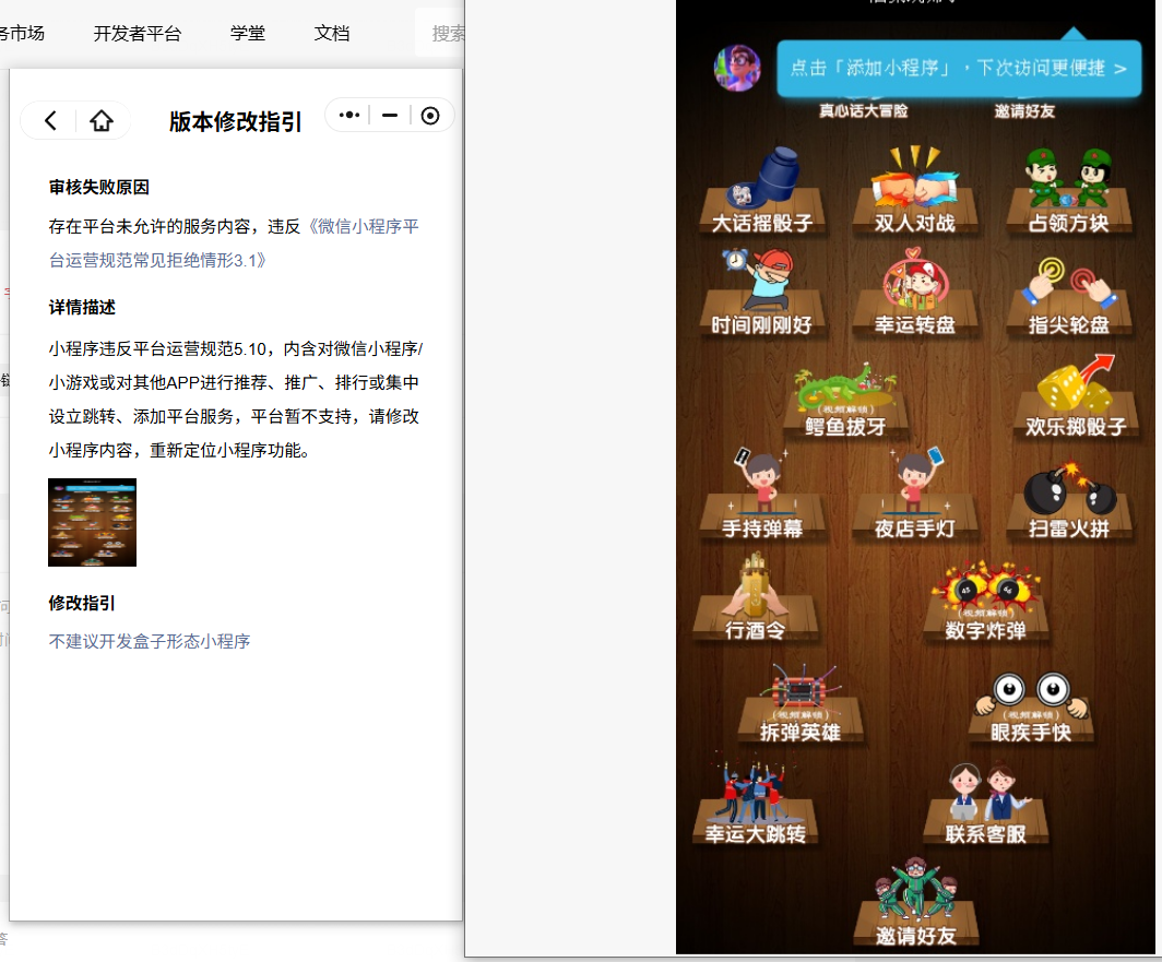 小程序违反平台运营规范5.10,内含对微信小程序/小游戏或对其他APP进行推荐、推广、排行或集中设立跳转、添加平台服务,平台暂不支持,请修改小程序内容,重新定位小程序功能。