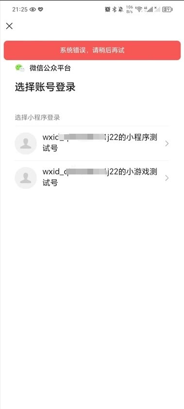 在申请完小程序测试号后,准备登录,扫码登录却提示“系统错误,请稍后再尝试”;