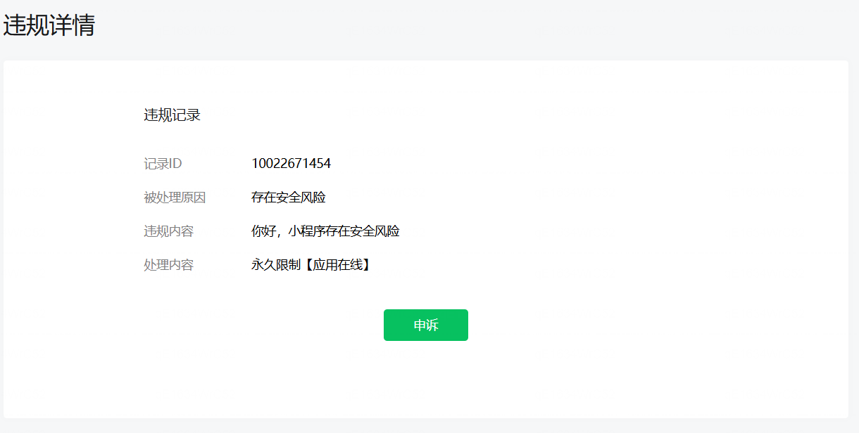 违规内容:你好,小程序存在安全风险,而且被永久封禁,代码全部检查了一遍,实在是没有找到原因,而且我的小程序不需要登陆,甚至连一个网络请求都没有,完全离线的小程序,而且数据也是被保存到本地的。实在是想不明白为什么,而且违规内容也没有提供有价值的信息。评论区乐于助人心肠超好的大神有没有遇到过同样的问题给解答一下。