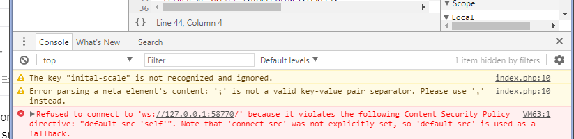 VM63:1 Refused to connect to 'ws://127.0.0.1:58770/' because it violates the following Content Security Policy directive: "default-src 'self'". Note that 'connect-src' was not explicitly set, so 'default-src' is used as a fallback.