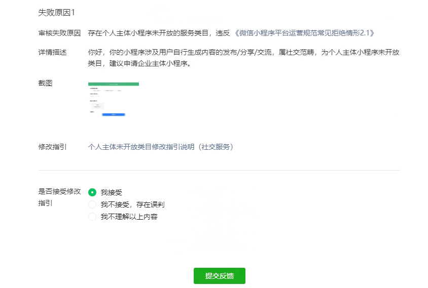 小程序应用开发里面在设置页面加上了一个反馈功能,目的是让使用者提交自己的优化建议、bug反馈问题,目前提交审核提示说是社交类目,个人不开放。