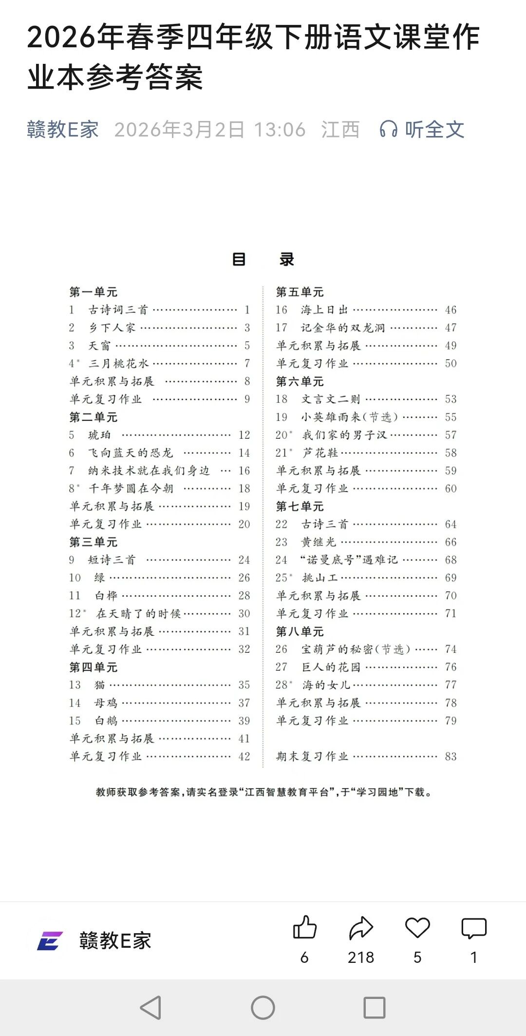 我的公众号因为发了“四年级语文下册《作业本》答案(”被平台处以极刑—永久封禁。我发的内容又没有产生不良影响,而且对师生有帮助,平台却处罚永久封禁,这样的处罚是不是太重了?而且一个名为“赣教E家的”的公众号发了同样的内容,却什么事都没有,请平台给出解释,不要店大欺客。