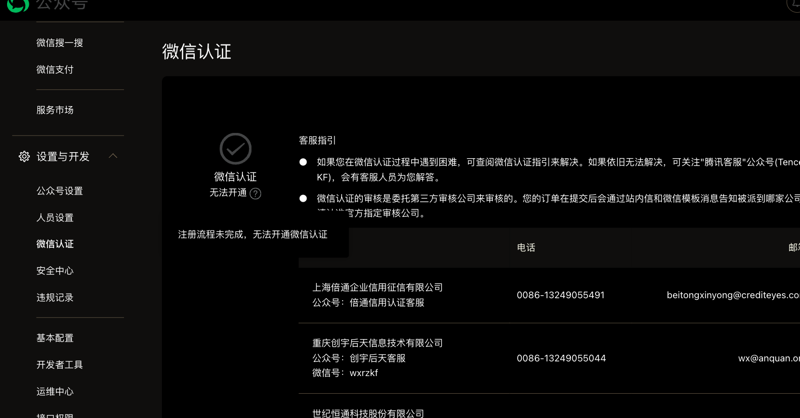 微信公众号,申请微信认证。提示“注册流程未完成,无法开通微信认证”,现在不知缺少哪步微信注册流程,也找不到继续注册的入口: gh_cd67f4f48764