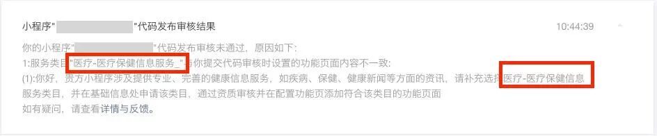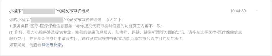 审核结果中已经提示,要在配置功能页添加通过资质审核的类目,将“医疗-医疗保健信息服务”类目,添加到配置功能页面(如下所示),然后重新提交审核。