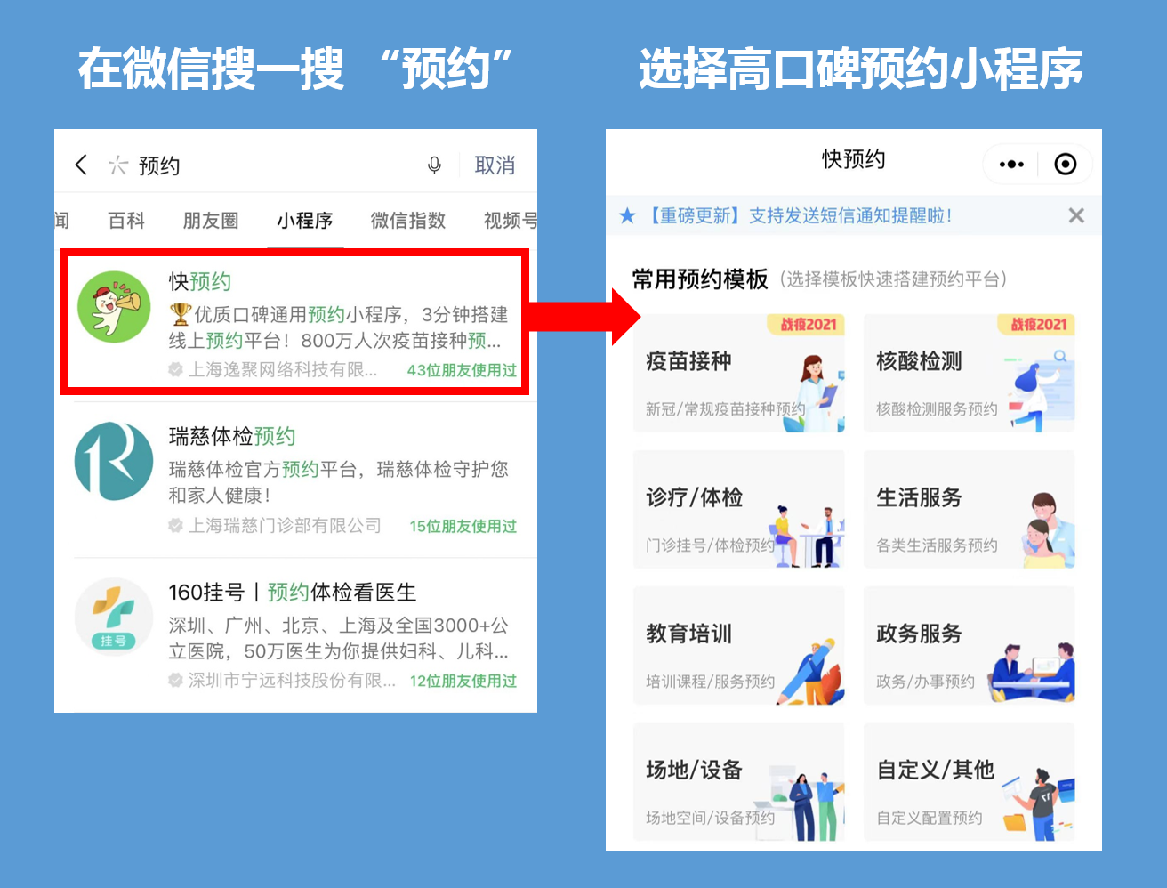 可在微信中搜一搜“预约”小程序,排名靠前的是微信基于用户规模和口碑优先推荐的产品,都可以试用看看,以下以支持免费使用的小程序 —【快预约】为例,具体介绍搭建步骤: