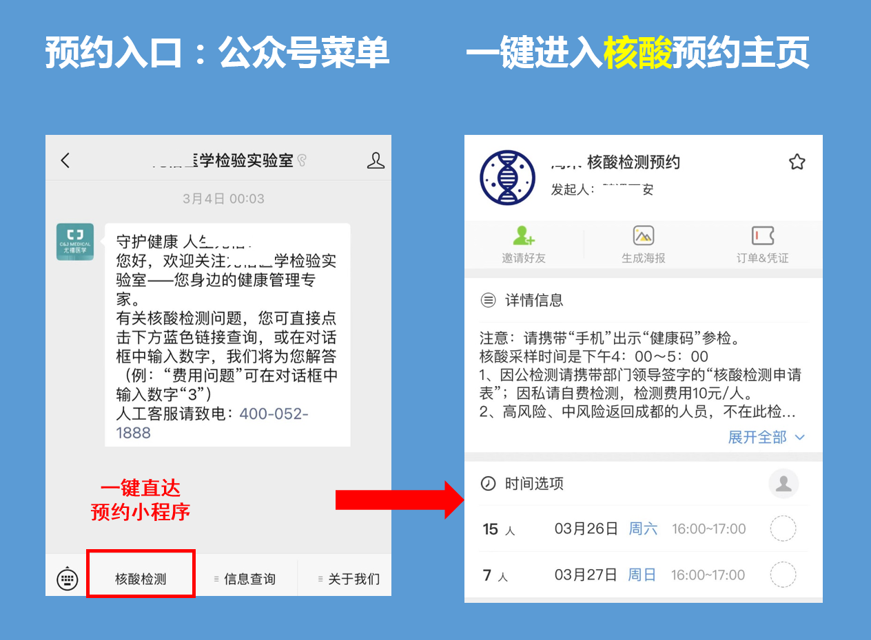 ① 医院/检测机构:点击公众号中的“核酸检测”菜单,一键进入预约主页面查看可约时间: