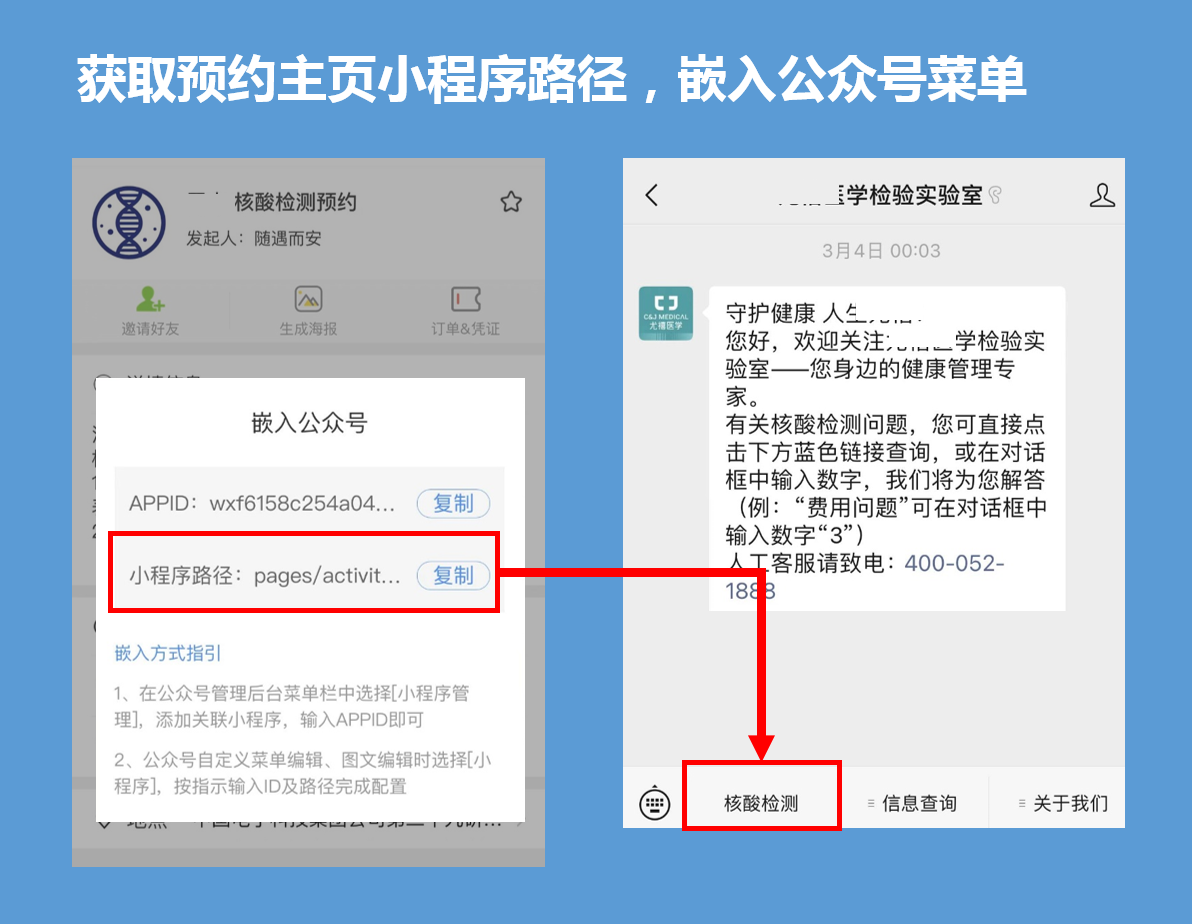 医院/检测机构:如果有运营公众号,可在预约主页底部的“分享”菜单中,获取到该页面的“小程序路径”后,即可嵌入到公众号菜单,公众号即刻拥有核酸检测预约功能: