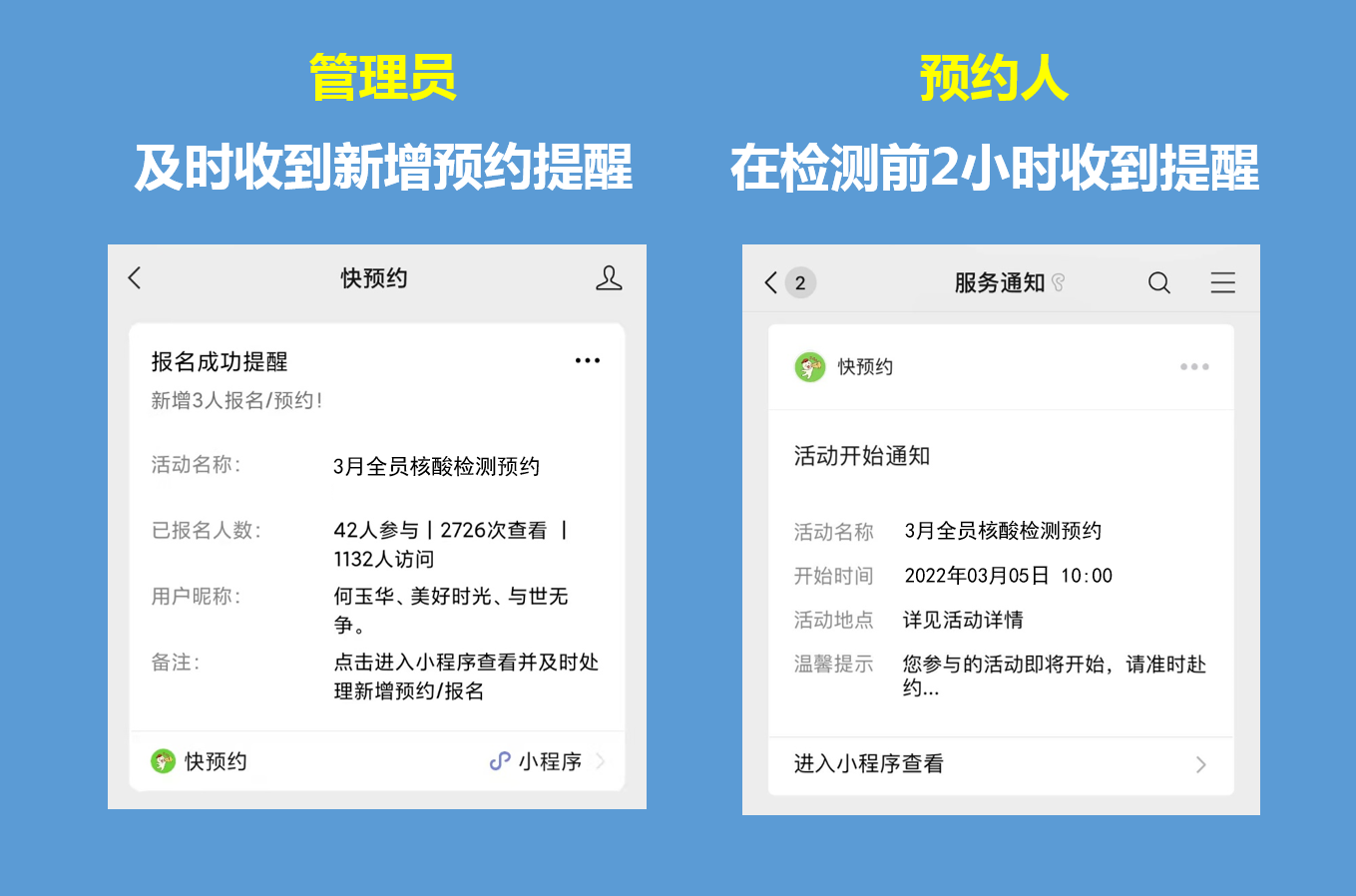 ④ 新增预约后,管理员可及时收到通知掌握最新预约状况,预约人也可以在检测开始前2小时,收到自动通知,提醒备忘: