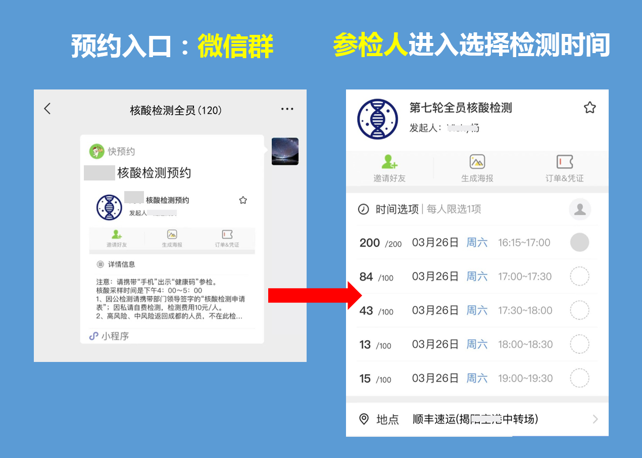 ② 群体集中检测:大家从分享在“微信群聊”中的预约链接进入后,选择自己参检的时间: