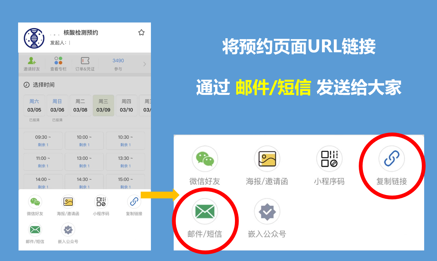 也可以将预约的小程序码或URL链接,通过短信发送给大家: