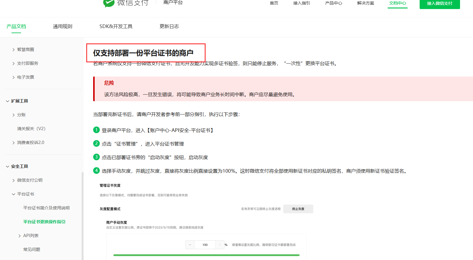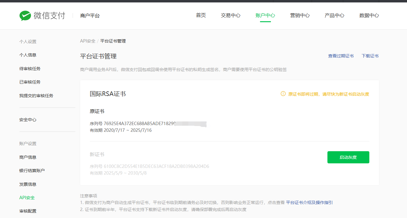 如图,我们商户平台提示,平台证书即将过期,我们属于单证书(非微信推荐的多证书),所以只能使用这种方案,该方案中需要提前获取到证书并部署,但是并没有入口供我们下载平台证书,我们该咋获取最新证书进行更新呢
