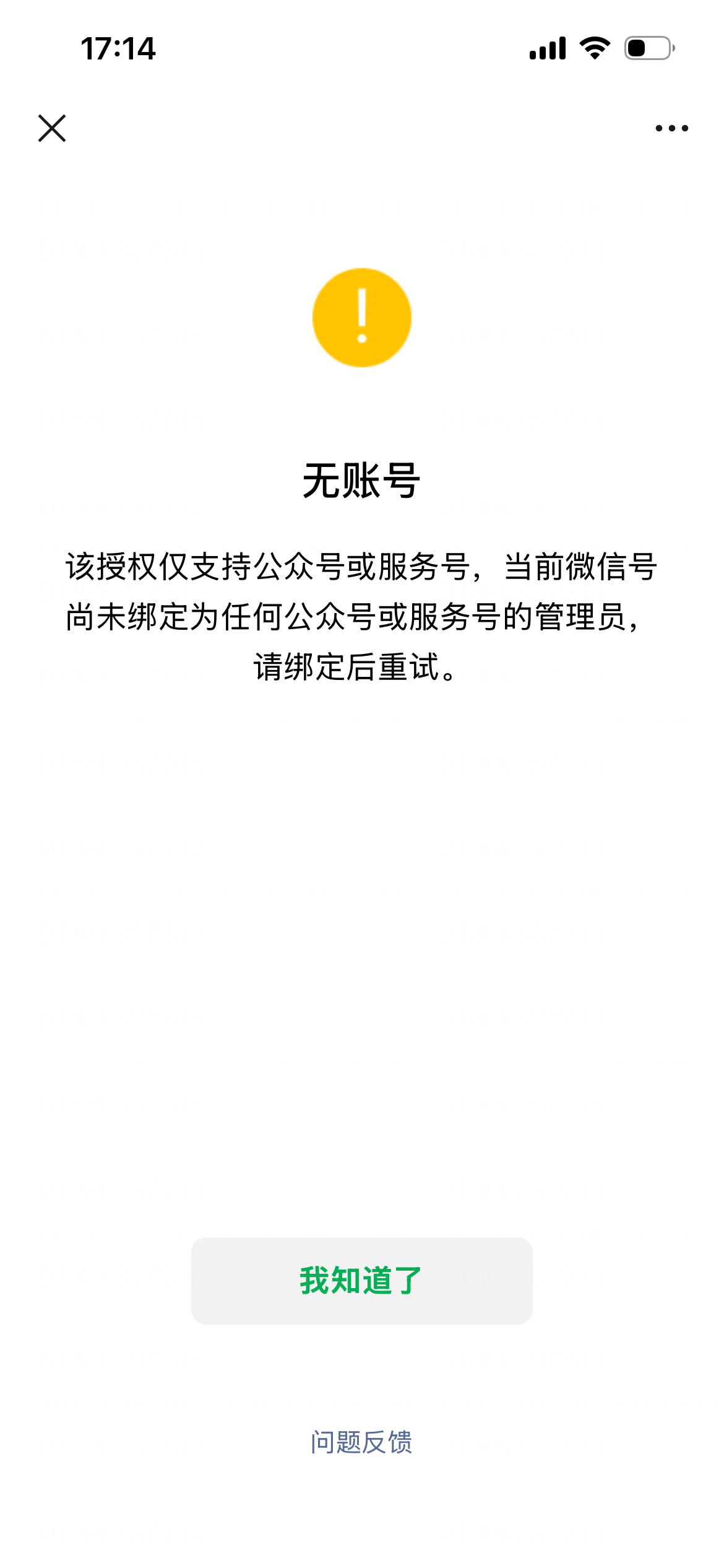 你好,请参考https://developers.weixin.qq.com/doc/oplatform/Third-party_Platforms/2.0/troubleshooting/authorization_troubleshooting.html#%E4%BA%94%E3%80%81%E5%95%86%E5%AE%B6%E6%8E%88%E6%9D%83%E6%8F%90%E7%A4%BA%E6%97%A0%E6%B3%95%E6%8E%88%E6%9D%83%E3%80%81%E6%97%A0%E8%B4%A6%E5%8F%B7自助排查