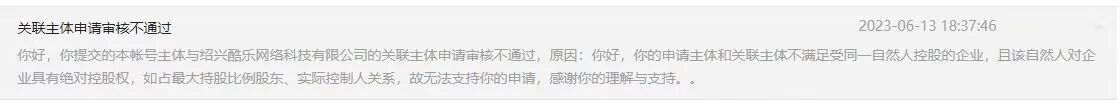 咨询下关联主体申请审核不通过的要求是什么?提示是这样的,你提交的本账号主体与绍兴酷乐网络科技有限公司的关联主体申请审核不通过,原因:你是申请主体和关联主体不满足受同一自然人控股的企业,且该自然人对企业具有绝对控股权,如占最大持股比例股东,实践控制人关系,故无法支持你的申请