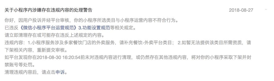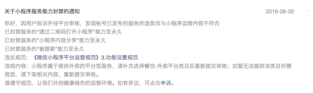 三、按说申诉成功,如果要再下架,肯定会有新的提醒,可是 在我们申诉成功后,8月30号,小程序竟然被突然下架,公司完全没有准备。