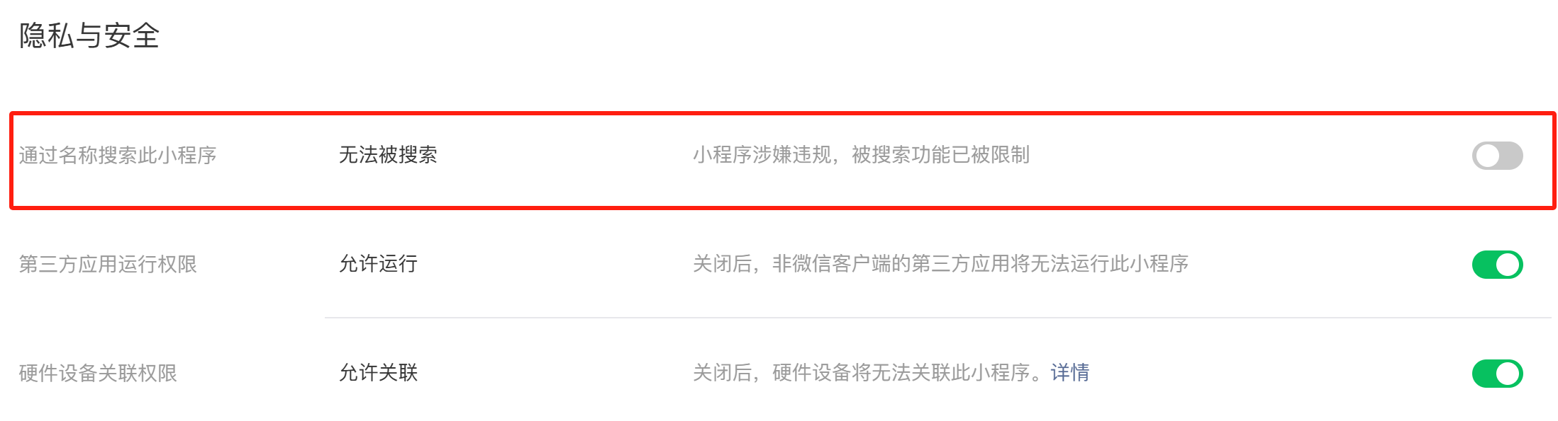 看了下你的小程序当前还未完成小程序备案,发布上线后将会被限制搜索,建议等备案通过后再看看哈。