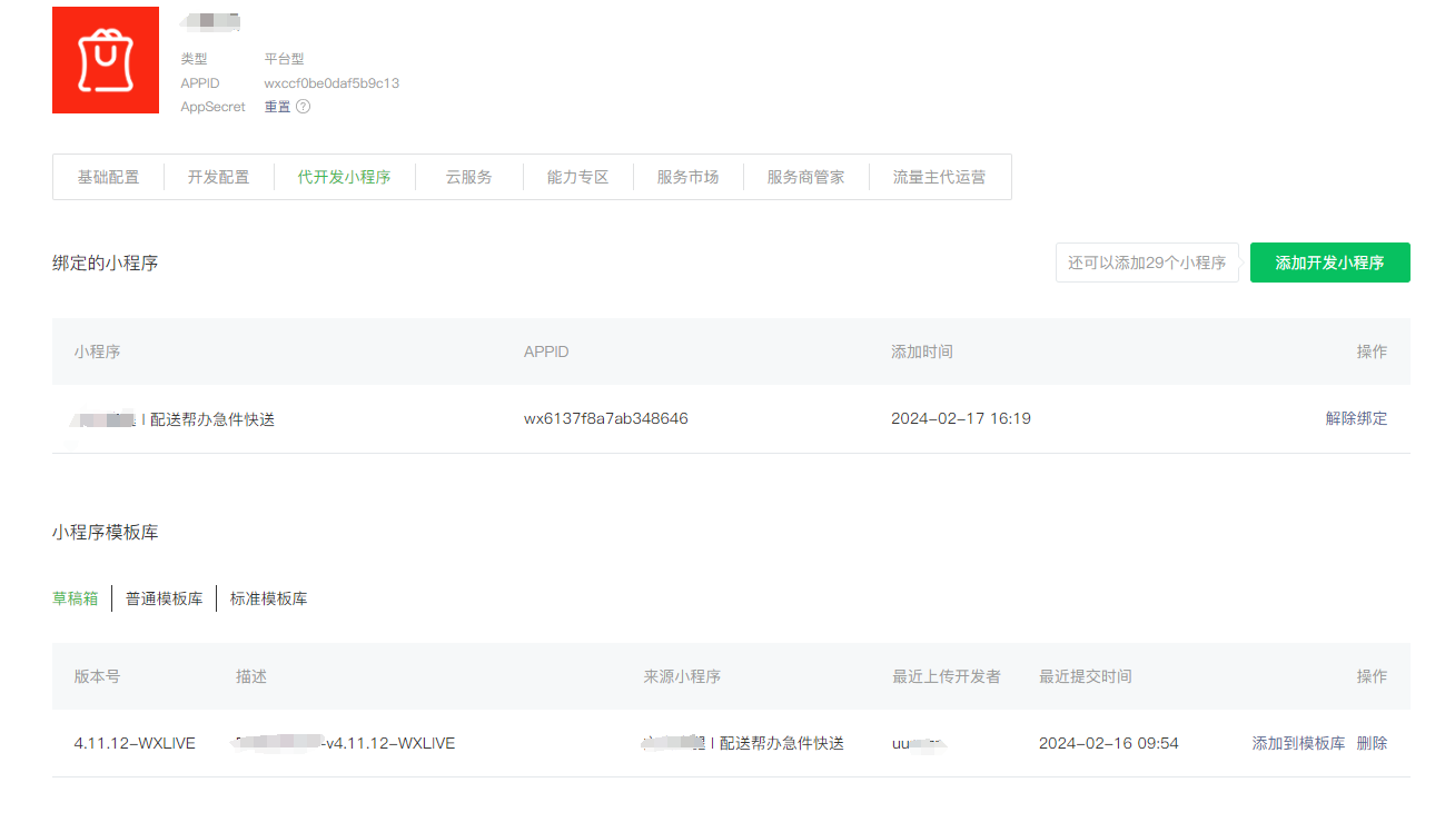 1、“代开发小程序”,先解绑第三方平台,再发布,然后再重新绑定第三方;