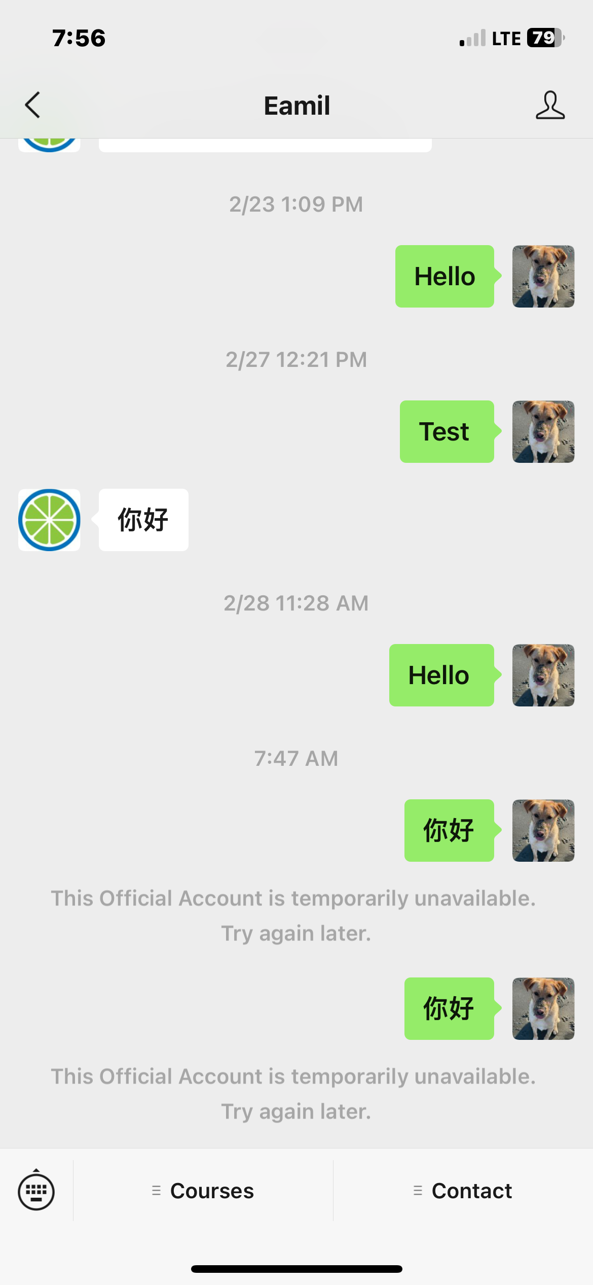 你好,我们有个公众号,名称是Eamil,现在往这个公众号发送信息会显示‘This Official Account is temporarily unavailable’.