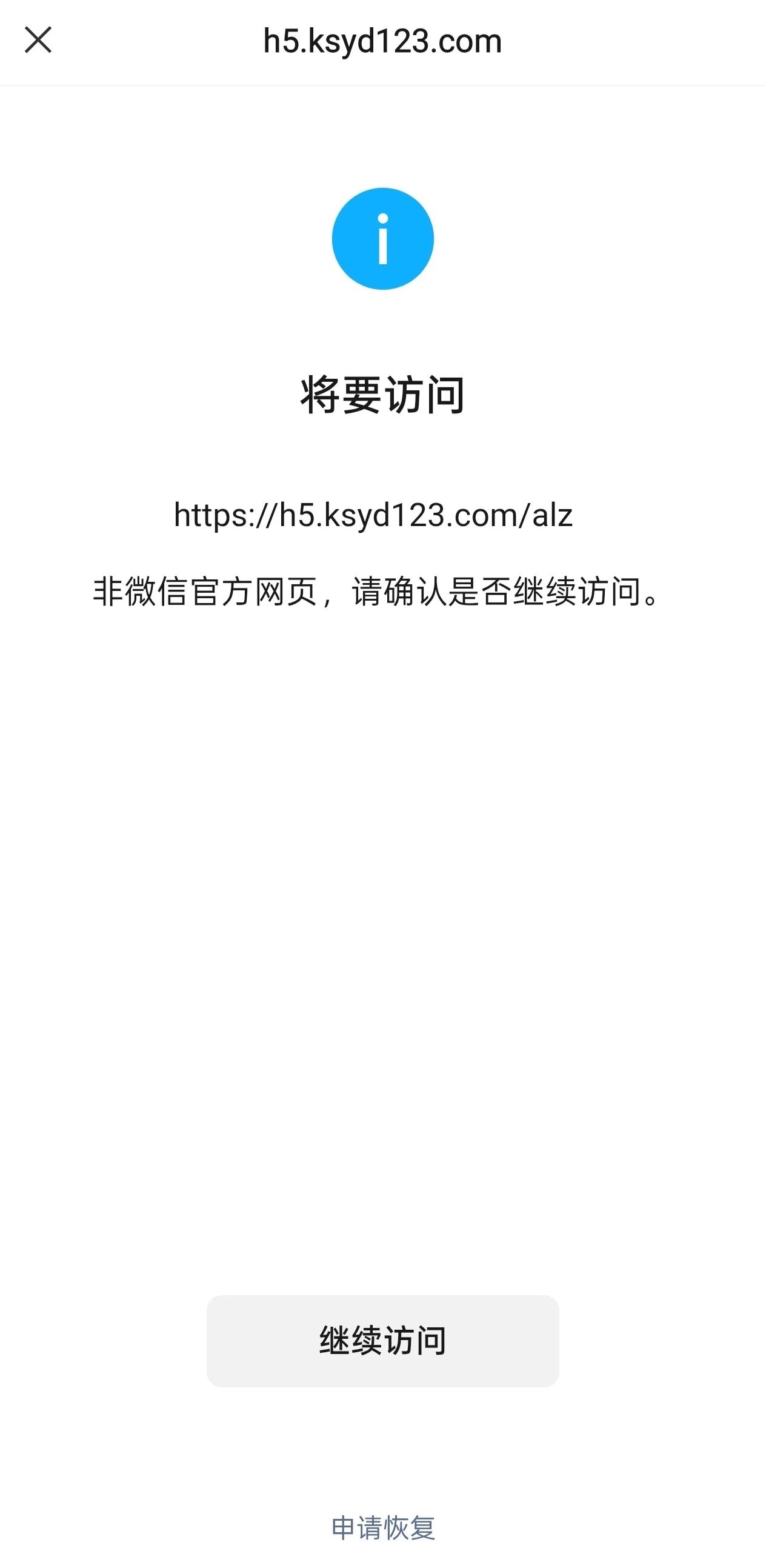 您好,域名(https://h5.ksyd123.com/alz)域名在腾讯云注册并备案通过,服务器也在腾讯云,浏览器访问正常,我是网站开发者,访问时间如图微信访问网站出现“非微信官方网页,请确认是否继续访问”,经检查网页里没有不安全的内容,是微信官方网页,请核实后帮忙解除拦截,谢谢!