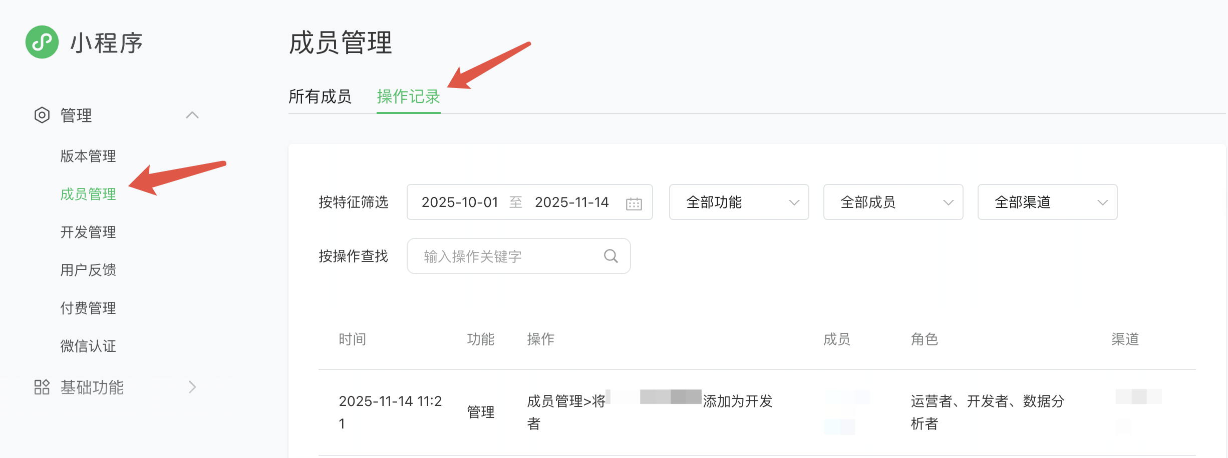 用户你好,可以通过 小程序管理后台->成员管理->操作记录 去查看操作日志。